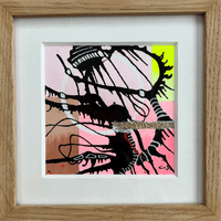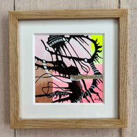 Smukt farverigt mini maleri i lækker egetræsramme i gyldne brune nuancer. Af Christina Julsgaard