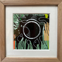 Smukt farverigt mini maleri i lækker egetræsramme i støvet grønne farver. Af Christina Julsgaard