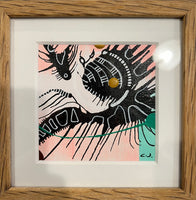 Smukt farverigt mini maleri i lækker egetræsramme i pink røde nuancer.