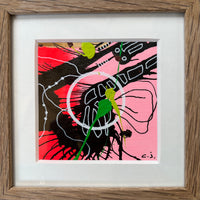 Smukt farverigt miniature maleri i lækker egetræsramme med smukke pink røde farver.