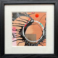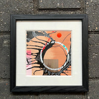 Smukt farverigt mini maleri i lækker egetræsramme i neon grule farver. Af Christina Julsgaard