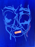 Mini unique handmade painting in dk. blue colour with brown screen print of a mask.