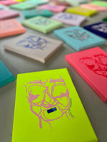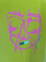 Mini unique handmade painting in lemon yellow with pink screen print of a mask.