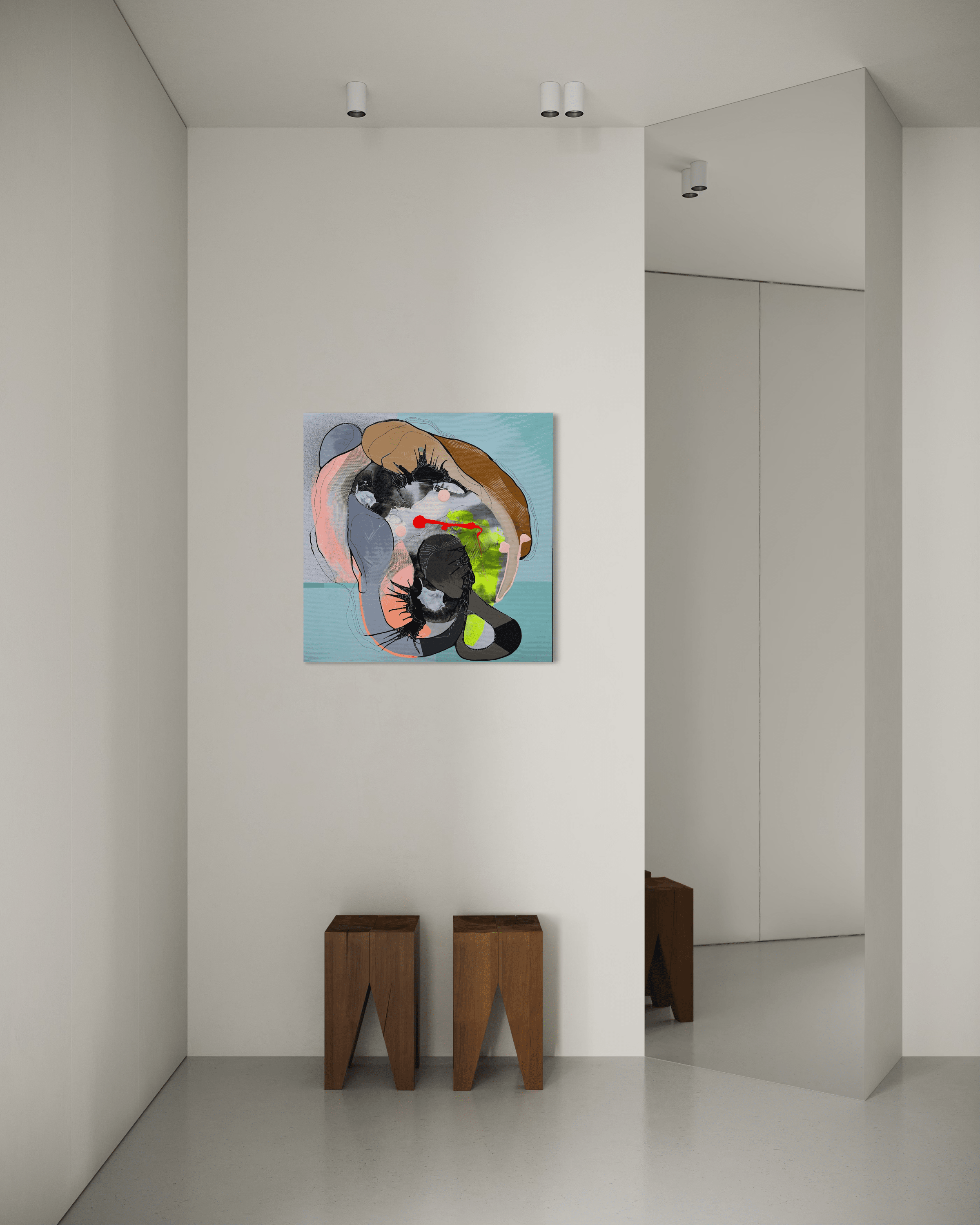 Farvepaletten bevæger sig i et spændingsfelt mellem det blide og det kraftfulde. Kølige turkise og mintgrønne toner skaber ro og dybde, mens det neonrøde centrum fungerer som en visuel eksplosion af energi. Sort og hvid bruges i præcise, nervelignende strukturer, og pastelrosa, fersken og lavendel tilføjer bløde overgange. De lyse partier giver maleriet en næsten glødende kvalitet, som forstærker dets levende udtryk.