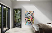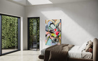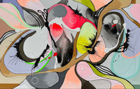 Farvepaletten er både sprælsk og afstemt. Neonrød og syrlig limegrøn skaber kontrast til de afdæmpede toner af grå, beige og lavendel. Hvide og sorte strukturer giver værket dramatik og rytme, mens transparente lag og flydende overgange tilføjer dybde. Enkeltstående farvefelter – som det glødende røde centrum og de friske minttoner – trækker øjet rundt og skaber en følelse af elektrisk bevægelse i hele kompositionen.