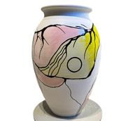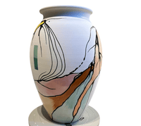 Skab et let og feminint udtryk i dit hjem med denne hånddekorerede keramikvase designet af Christina Julsgaard. Vasen er præget af bløde lyserøde og grønne nuancer, der skaber en elegant og drømmende farvepalet. Et subtilt twist af blå tilfører en ekstra dimension og dybde, hvilket giver vasen et kunstnerisk og moderne udtryk. Da hver vase er håndmalet, er den helt unik – der findes kun én præcis som denne.