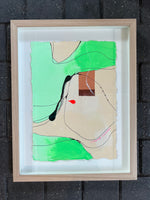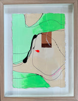 Einzigartiges Gemälde auf indischem Büttenpapier im Rahmen mit sandfarbenem Hintergrund und grasgrünem und goldenem Motiv. Von Hand bemalt, von Grund auf. Es gibt nur ein Gemälde mit diesem Motiv. Acryl auf indischem Papier, gerahmt in tiefem Eichenholzrahmen. Ein zartes und schlichtes Kunstwerk mit einem schönen Rahmen. 39X50 cm Außenmaß inkl. rahmen.