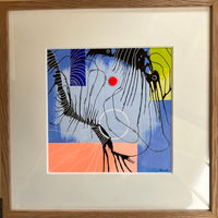 Painting in a narrow, beautiful oak frame with painting in bluish colors and an abstract motif.