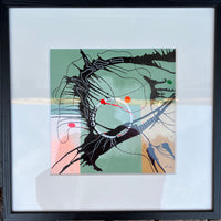 Painting in a narrow, beautiful oak frame with painting in pinkish-reddish colors and an abstract motif.