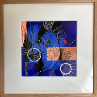 Painting in a narrow, beautiful oak frame with painting in ultramarine blue colors and abstract motif.