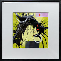 Painting in a narrow black wooden frame with a yellow abstract motif.