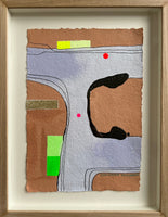 Painting on handmade Indian paper with golden brown background and purple motif including oak frame.