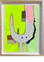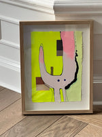 This minimalist Scandinavian painting is made on handmade Indian paper, where the neon yellow background with the pink motif forms a cool and eye-catching base for the graphic, colorful motif. The painting balances between abstract and graphic expression, where the bright colors and simple composition draw the eye towards its subtle but powerful details. The artwork is unique, as it only exists in one copy. It is painted with acrylic and framed in an elegant and deep oak frame, which adds a warm and sophisticated edge to the work. This delicate combination of materials and colors creates a harmonious and timeless aesthetic that emphasizes the Scandinavian design principle of simplicity and natural beauty. All measurements include the beautifully handmade frame, making the painting ready to hang as an elegant statement piece in any room.